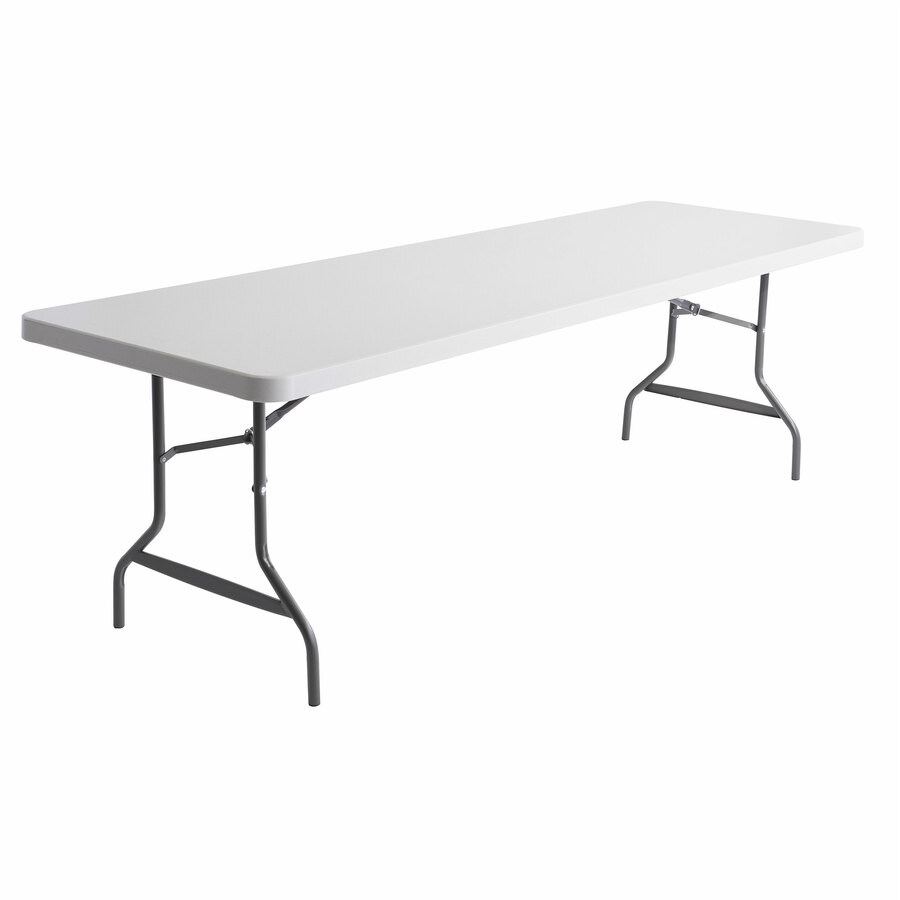 Lightweight and durable folding table for indoor and outdoor use. Legs fold into underside cavity for safe storage and easy transport. Made with blow-molded high-density polyethylene top is dent-, scratch- and water-resistant. Banquet Tables"Holds up to 1,000 lbs. evenly distributed. Square edge. Top Color: Platinum; Color Family: Gray; Top Shape: Rectangular; Overall Width: 96".