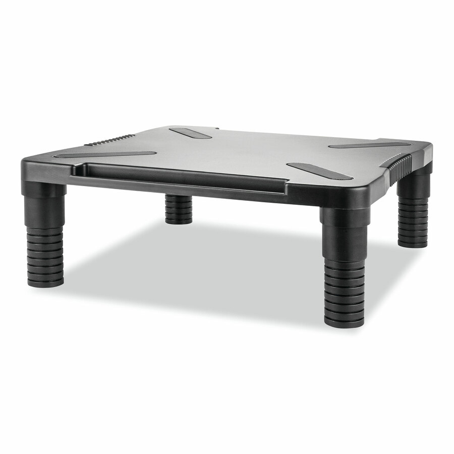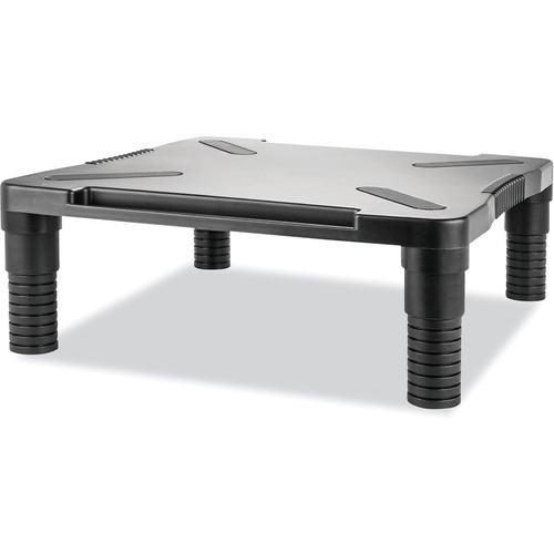 Elevates monitor to provide a more comfortable viewing level. Cable manager in the back keep cords tangle-free. Constructed from strong durable plastic. Non-skid rubber feet protects surface. Fits most flat panel monitors up to 24''. Stand Type: Monitor; Width: 13 1/8"; Depth: 13 1/2"; Maximum Height: 4".