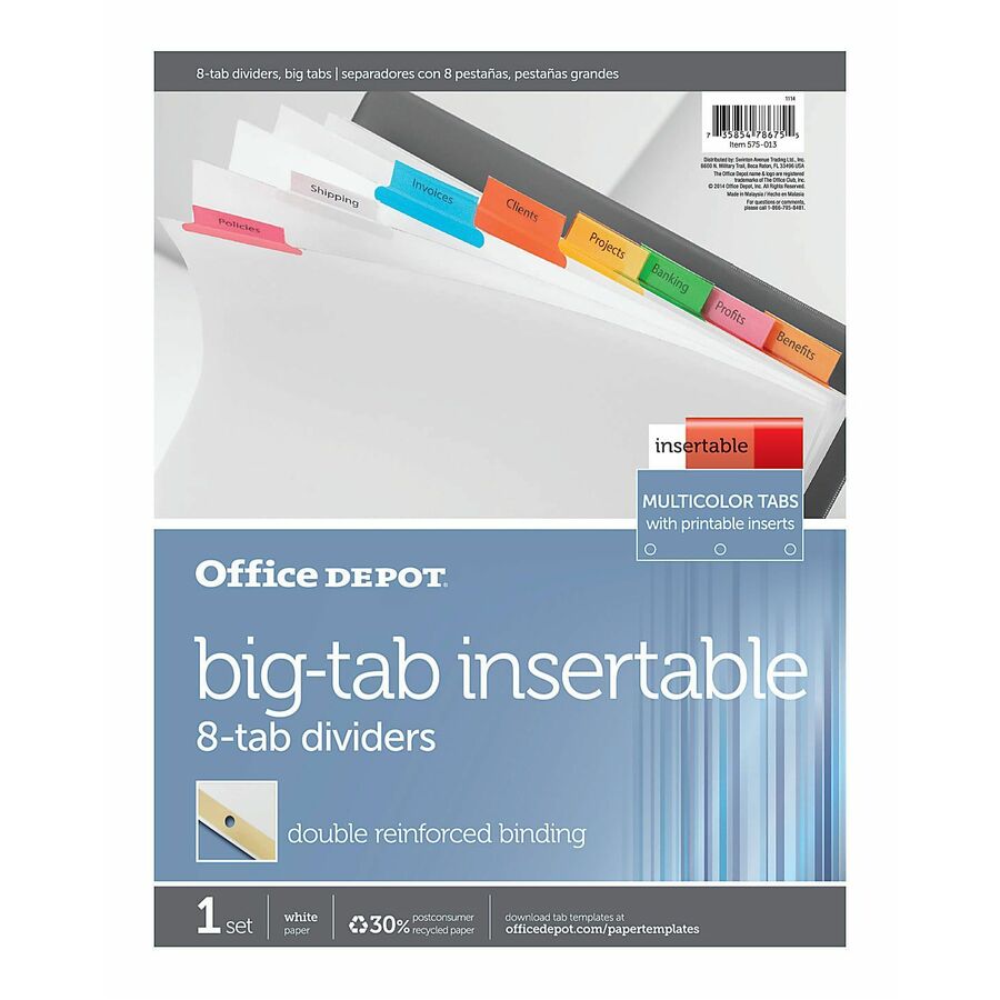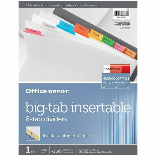 Office Depot® Brand Insertable Dividers With Big Tabs, White, Assorted Colors, 8-Tab
