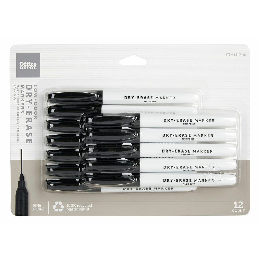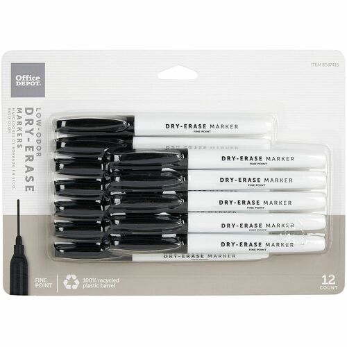 Office Depot® Brand Low-Odor Pen-Style Dry-Erase Markers, Fine Point, 100% Recycled Plastic Barrel, Black Ink, Pack Of 12